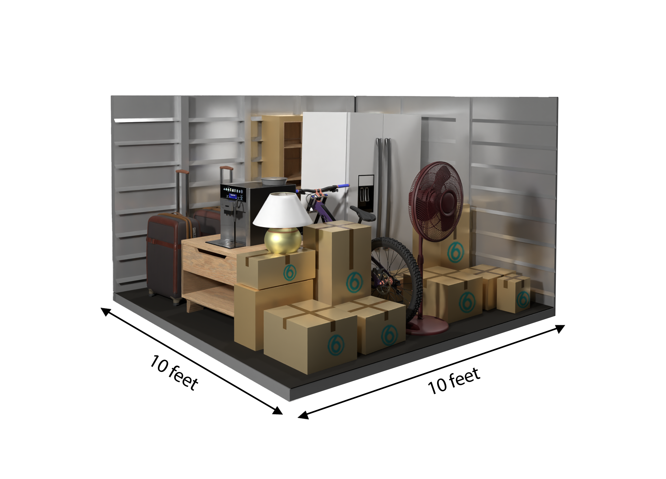 Our 10×10 units are about the size of a small bedroom, roughly 100 sq ft. They will hold furniture from a 1-2 bedroom apartment (sofa, chairs, coffee table, dressers), several large appliances, 10-15 medium boxes plus miscellaneous boxes.